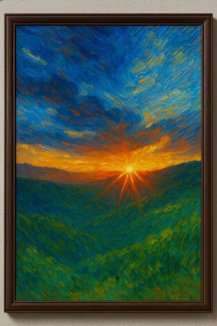 O quadro retratava um pôr do sol. As várias tonalidades de laranja se misturavam com o azul do céu e o tom esverdeado do vale e das montanhas que estavam ao fundo.