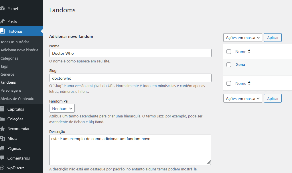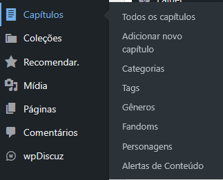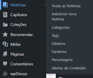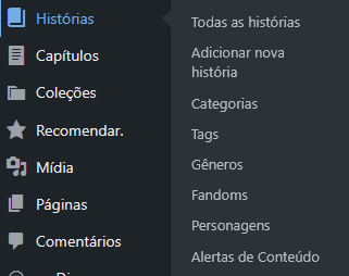 Relembrando O menu histórias permite que você escreva um resumo sobre o que é sua fic. E o menu capítulos é onde você adiciona os capítulos da sua história efetivamente.