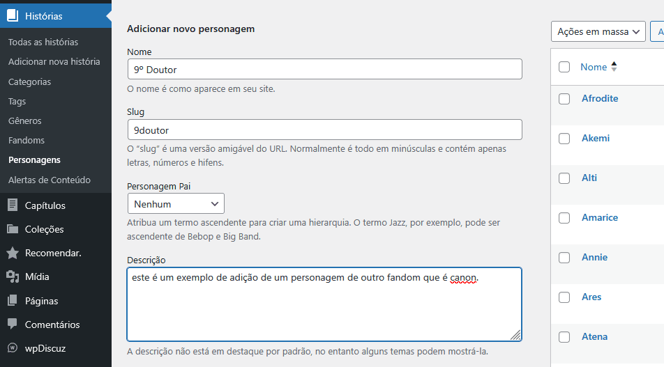 A orientação que eu damos é que vocês usem para personagens que existem nos fandons de maneira canônica porque essas tags vão ajudar os leitores a encontrar as histórias nas buscas tanto do site quanto no uso de taxonomias de buscadores (Google, DuckDuckGo, Bing, etc)