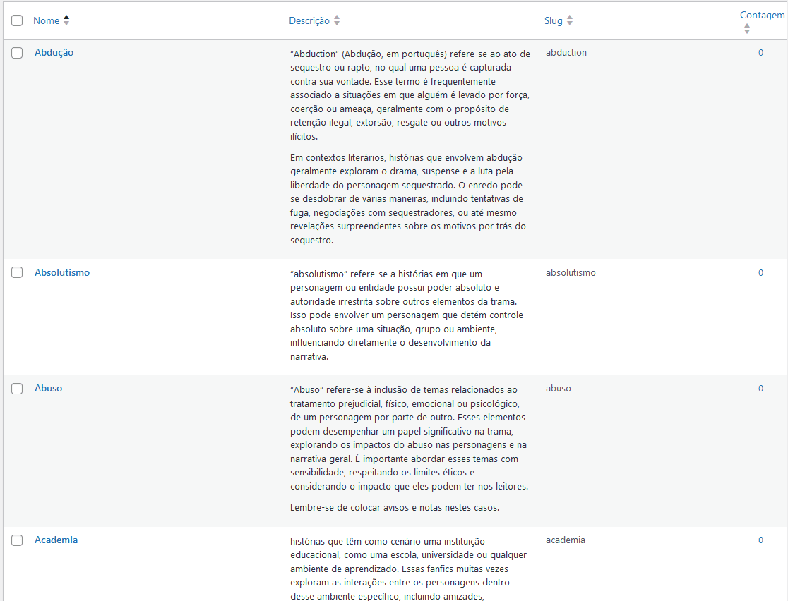 No menu interno destinado aos escritores, ao realizar o login e acessar a seção “Stories > Tags”, disponibilizamos uma lista abrangente com 360 tags pré-definidas. Além de servirem como categorias, essas tags fornecem descrições detalhadas, podendo até mesmo inspirar novas ideias para histórias.